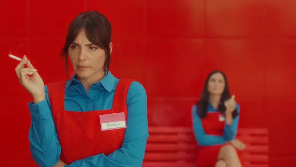 Y Javier Polo ha trabajado otra cosa de una manera riquísima: el color. Es de una complejidad absoluta comentar la paleta cromática de ‘Pequeños calvarios’, puesto que lo saturado y lo vibrante son una constante durante el metraje, pero siempre con un trabajo que se comporta como otro personaje más de la película. Es difícil porque se me hace complejo de comentar como funciona, como resulta tan positiva para la película siendo tan intensa para la vista general: los rojos, un traje que vemos del color de un croma, trabajar con estampados en ropas y paredes… son recursos potentísimos que hacen que la visión se quede pegada en la pantalla y que, reitero, sea un personaje más que ofrece al espectador una atmósfera poderosa. Precisamente esa ambientación en el hilo conductor y en los capítulos de la película es muy auténtica, muy reconocible si se ve después de haberlo visto; algo que se queda en tu memoria y la tienes reconocida, que unida a ese guion tan divertido conforman una dualidad que es perfecta para la película: cada tempo de diálogos trabaja a la perfección con el ambiente que tenemos presente.